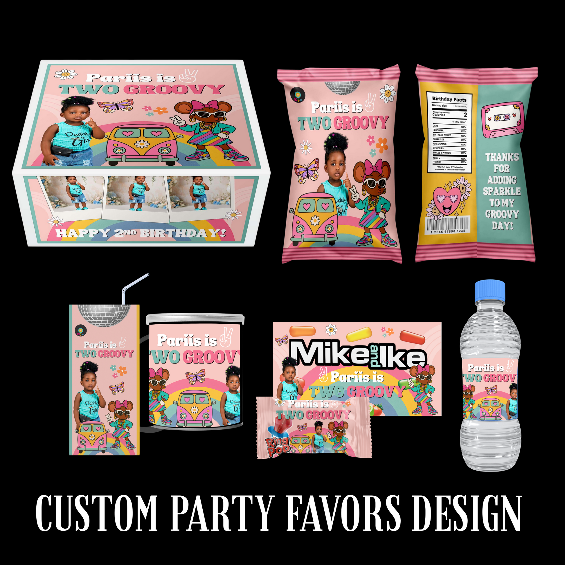 A $35 design fee applies to all custom party favor creations, covering four items: chip bag, water bottle label, fruit snacks, and rice krispy treat designs. Additional designs are available at $5 each.